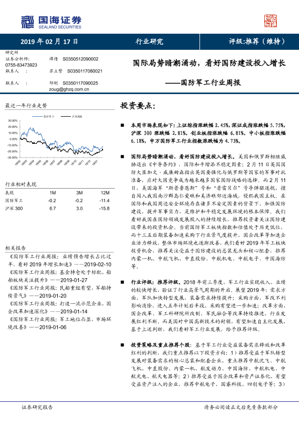 【国海证券】【20190217】国防军工行业周报:国际局势暗潮涌动,看好国防建设投入增长-14页