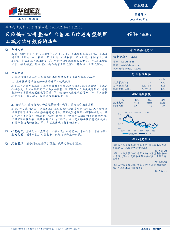 【华创证券】【20190217】军工行业周报2019年第6期:风险偏好回升叠加行业基本面改善有望使军工成为攻守兼备的品种-13页