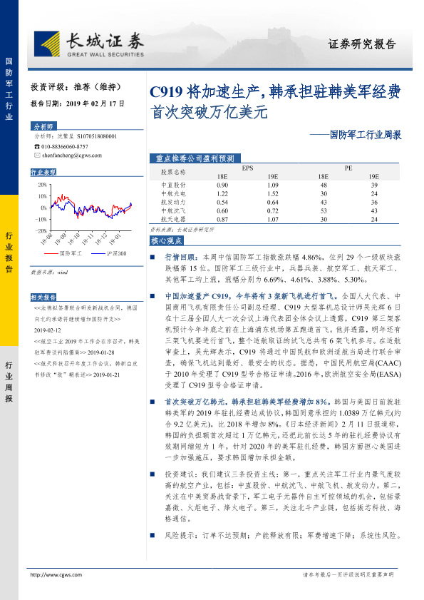 【长城证券】【20190217】20190217-长城证券-国防军工行业周报:C919将加速生产,韩承担驻韩美军经费首次突破万亿美元-13页