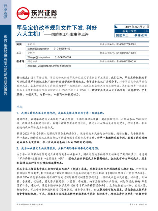 【东兴证券】【20190221】国防军工行业事件点评:军品定价改革规则文件下发,利好六大主机厂-6页
