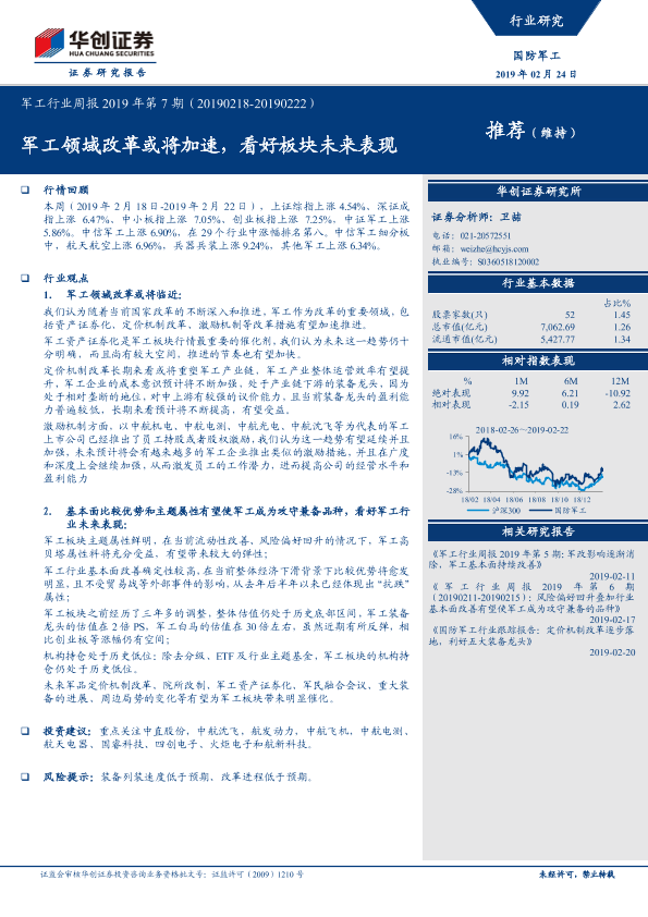 【华创证券】【20190224】军工行业周报2019年第7期:军工领域改革或将加速,看好板块未来表现-15页