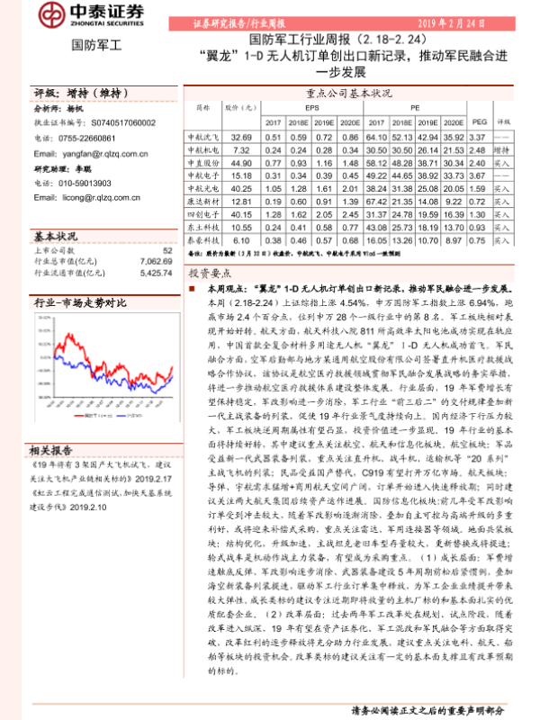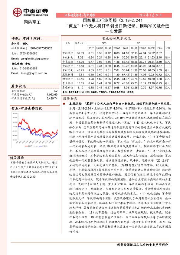 【中泰证券】【20190224】国防军工行业周报:“翼龙”1-D无人机订单创出口新记录,推动军民融合进一步发展-14页
