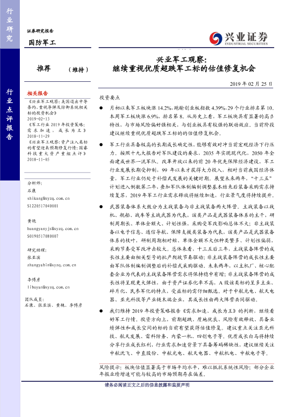 【兴业证券】【20190225】兴业军工观察:继续重视优质超跌军工标的估值修复机会-4页