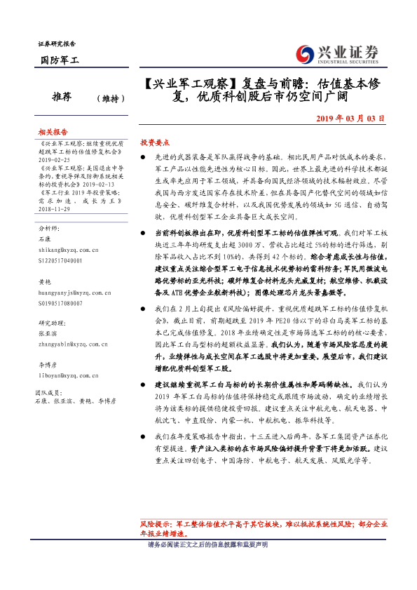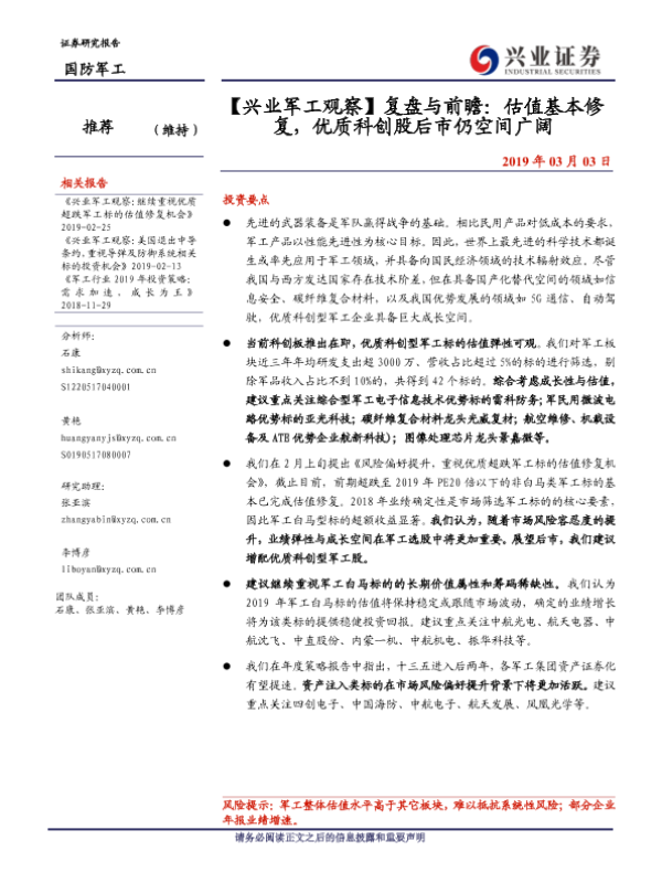 【兴业证券】【20190303】【兴业军工观察】复盘与前瞻:估值基本修复,优质科创股后市仍空间广阔-4页