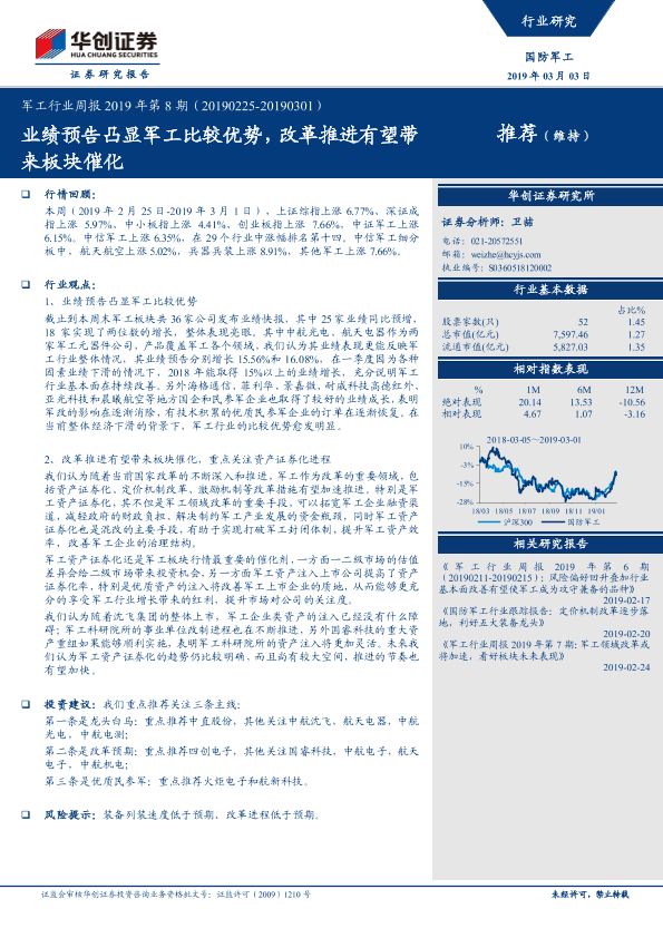 【华创证券】【20190303】军工行业周报2019年第8期:业绩预告凸显军工比较优势,改革推进有望带来板块催化-18页