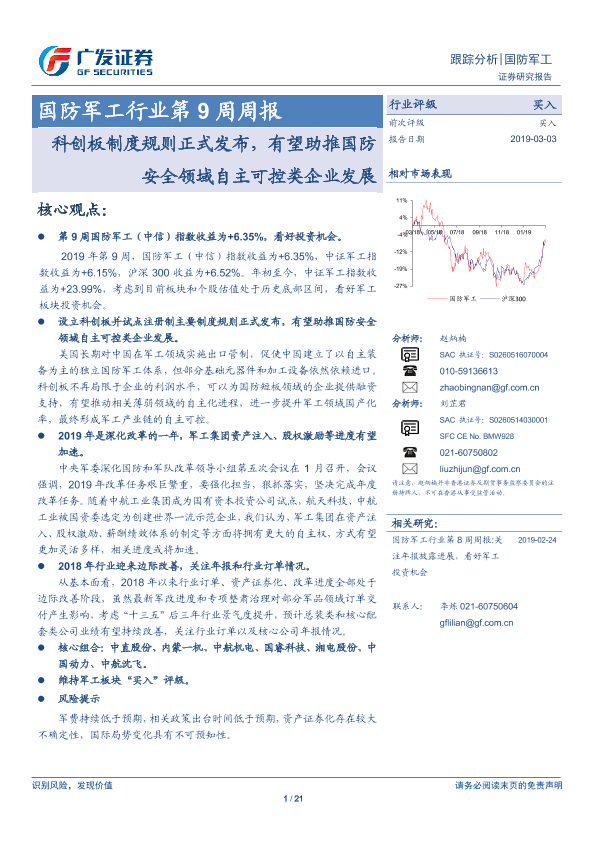 【广发证券】【20190303】国防军工行业第9周周报:科创板制度规则正式发布,有望助推国防安全领域自主可控类企业发展-21页
