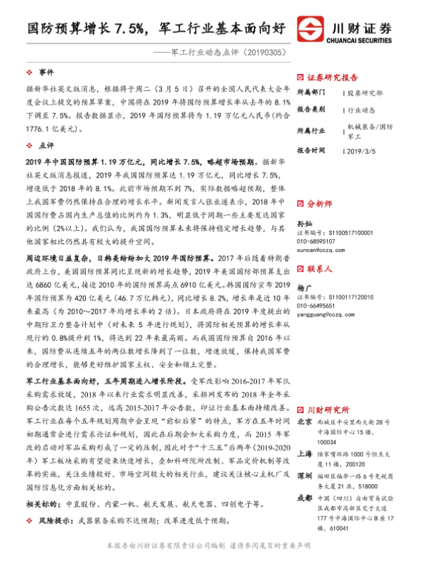 【川财证券】【20190305】军工行业动态点评:国防预算增长7.5%,军工行业基本面向好-2页