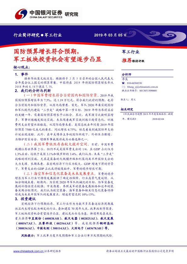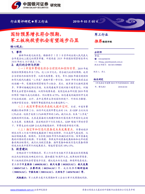 【银河证券】【20190305】国防军工行业:国防预算增长符合预期,军工板块投资机会有望逐步凸显-3页
