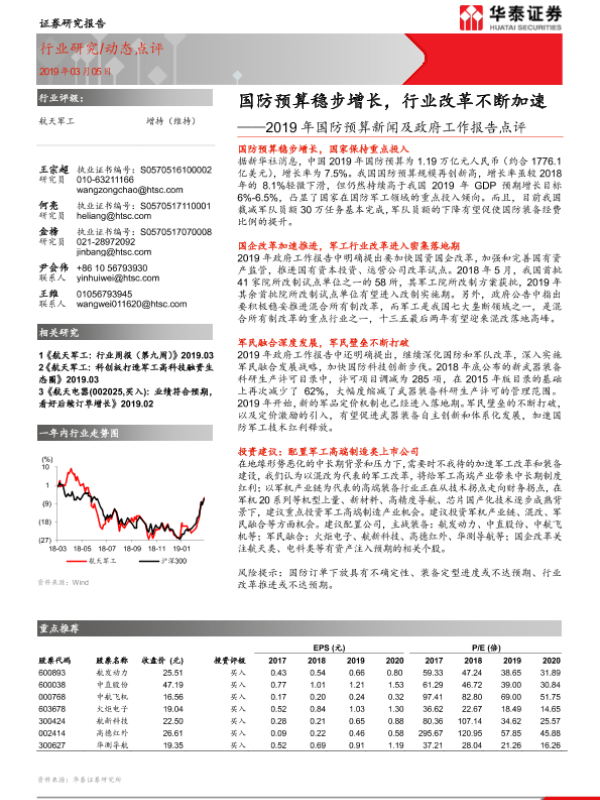 【华泰证券】【20190305】2019年国防预算新闻及政府工作报告点评:国防预算稳步增长,行业改革不断加速-2页
