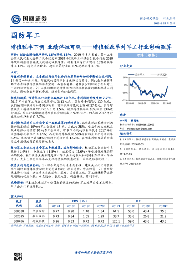 业绩弹性 减税降费 国防军工 增值税改革 行业影响