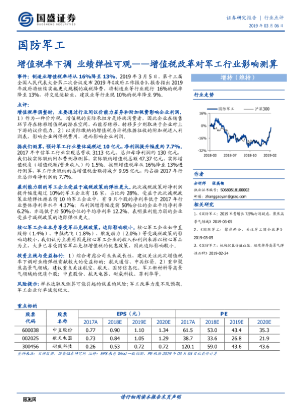 【国盛证券】【20190306】国防军工行业点评:增值税率下调 业绩弹性可观——增值税改革对军工行业影响测算-8页