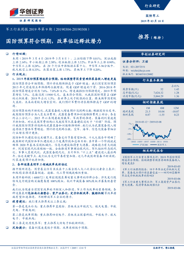 【华创证券】【20190310】军工行业周报2019年第9期:国防预算符合预期,改革临近释放潜力-14页