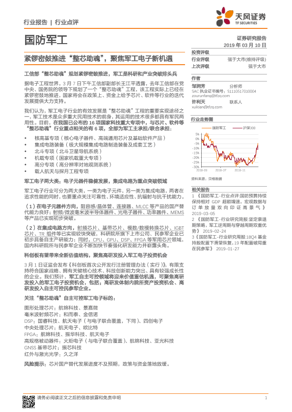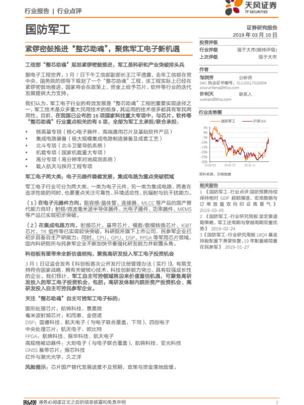 【天风证券】【20190310】国防军工行业点评:紧锣密鼓推进“整芯助魂”,聚焦军工电子新机遇-4页