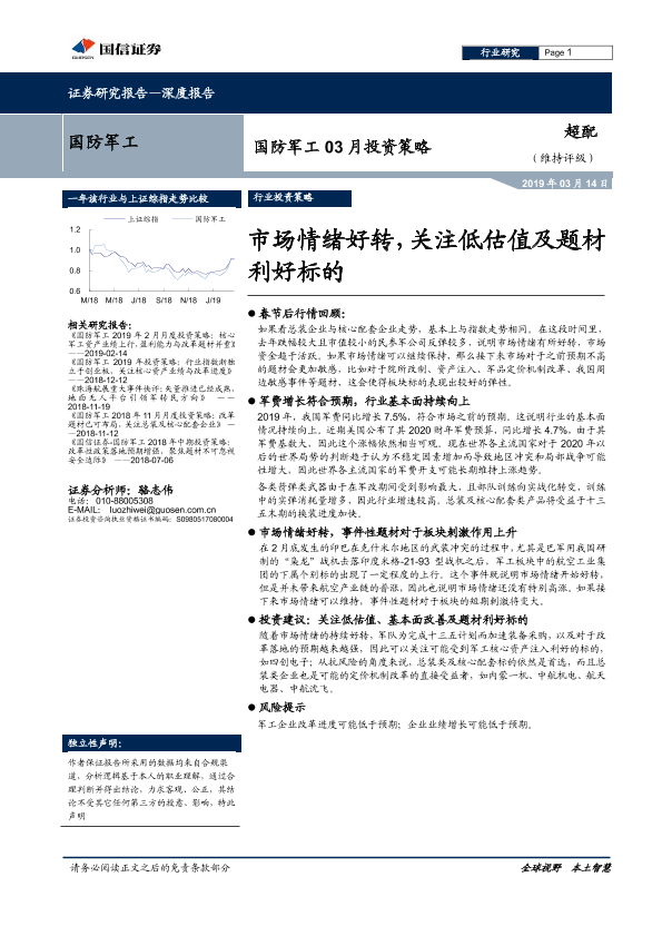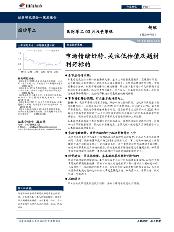 【国信证券】【20190314】国防军工03月投资策略:市场情绪好转,关注低估值及题材利好标的-10页