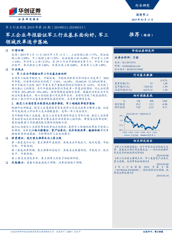 【华创证券】【20190317】军工行业周报2019年第10期:军工企业年报验证军工行业基本面向好,军工领域改革逐步落地-15页