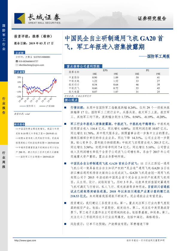 【长城证券】【20190317】20190317-长城证券-国防军工周报:中国民企自主研制通用飞机GA20首飞,军工年报进入密集披露期-13页