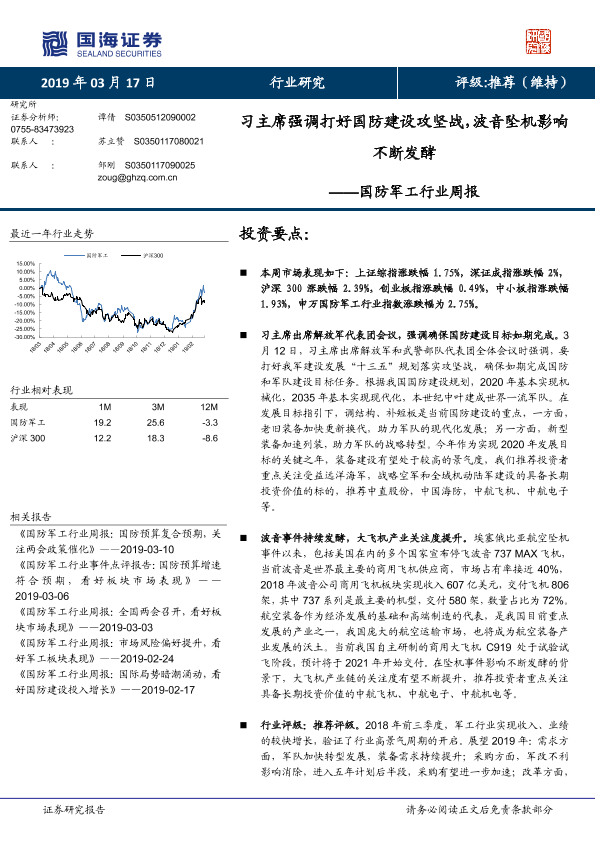 【国海证券】【20190317】国防军工行业周报:习主席强调打好国防建设攻坚战,波音坠机影响不断发酵-14页