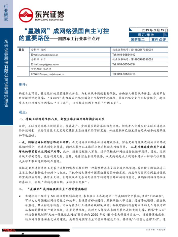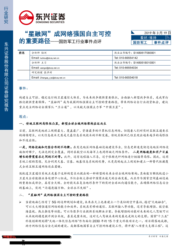 【东兴证券】【20190319】国防军工行业事件点评:“星融网”成网络强国自主可控的重要路径-4页
