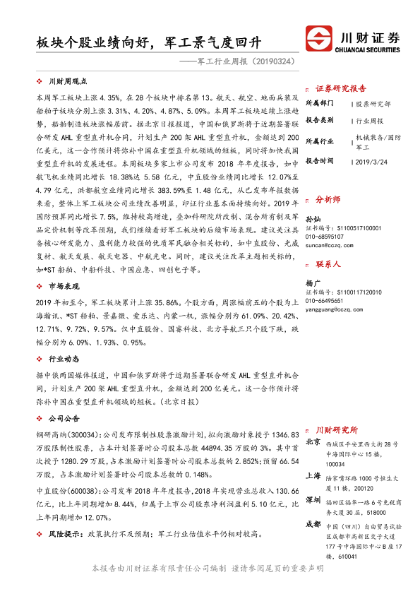 【川财证券】【20190324】军工行业周报:板块个股业绩向好,军工景气度回升-9页