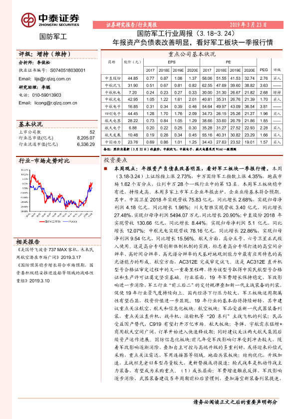 【中泰证券】【20190323】国防军工行业周报:年报资产负债表改善明显,看好军工板块一季报行情-16页
