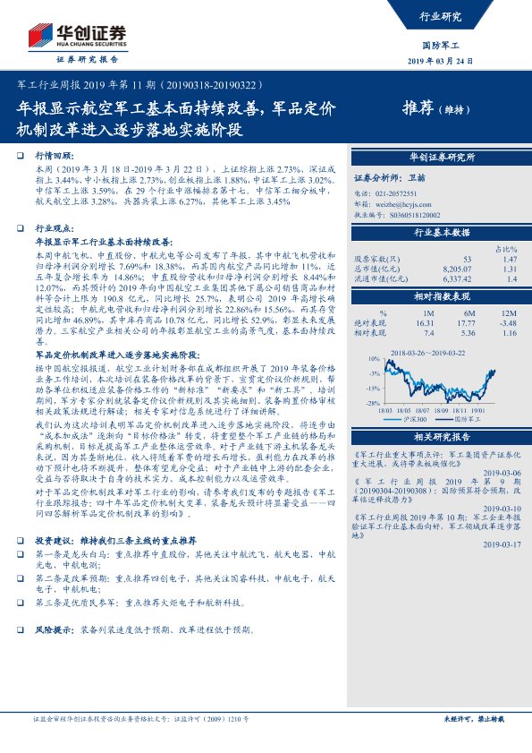 【华创证券】【20190324】军工行业周报2019年第11期:年报显示航空军工基本面持续改善,军品定价机制改革进入逐步落地实施阶段-15页