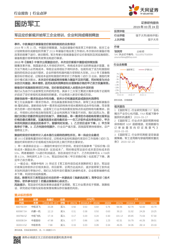 【天风证券】【20190324】国防军工行业点评:军品定价新规开始军工企业培训,企业利润或得到释放-3页
