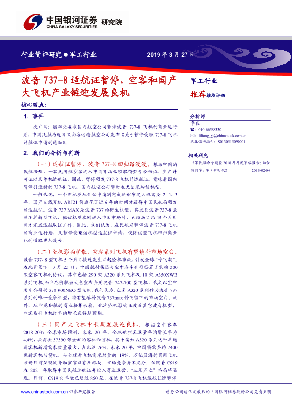【银河证券】【20190327】20190327-中国银河-军工行业简评研究:波音737-8适航证暂停,空客和国产大飞机产业链迎发展良机-5页