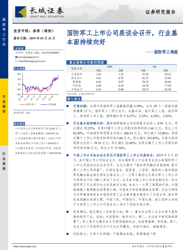 【长城证券】【20190324】20190324-长城证券-国防军工周报:国防军工上市公司座谈会召开,行业基本面持续向好-16页