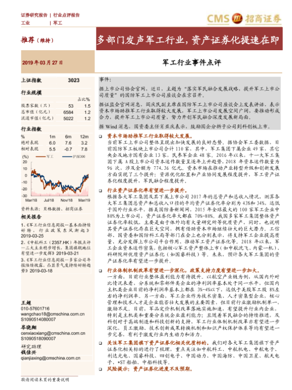 军工行业 军民融合 政策支持 资产证券化 资本市场