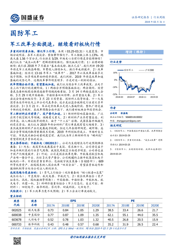 【国盛证券】【20190331】国防军工行业周报:军工改革全面提速,继续看好板块行情-16页