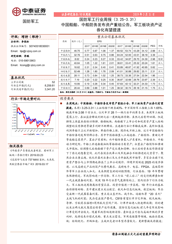 【中泰证券】【20190331】国防军工行业周报:中国船舶、中船防务发布资产重组公告,军工板块资产证券化有望提速-18页