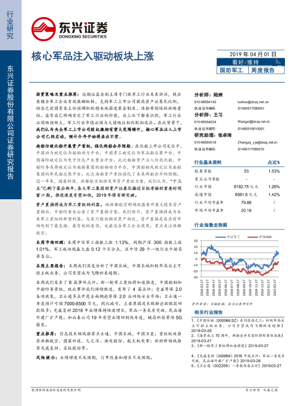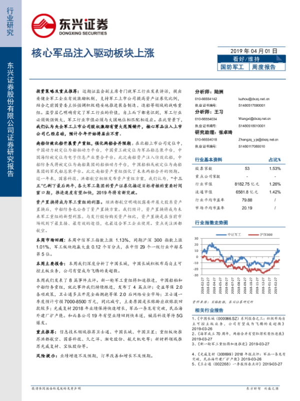 【东兴证券】【20190401】国防军工周度报告:核心军品注入驱动板块上涨-19页