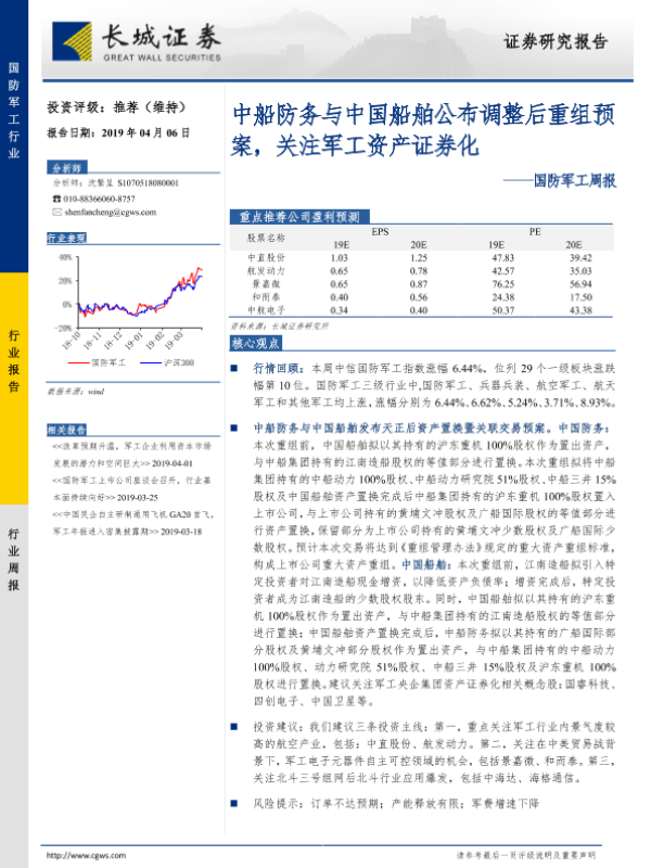 【长城证券】【20190406】20190406-长城证券-国防军工周报:中船防务与中国船舶公布调整后重组预案,关注军工资产证券化-14页