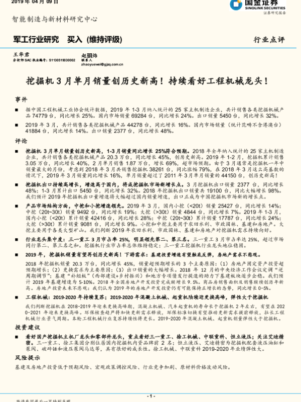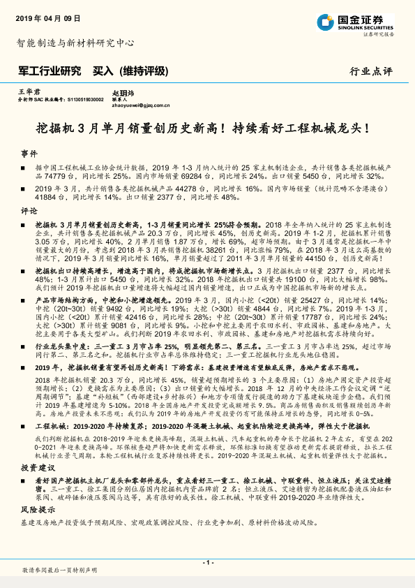 【国金证券】【20190409】20190409-国金证券-军工行业点评:挖掘机3月单月销量创历史新高!持续看好工程机械龙头!-3页