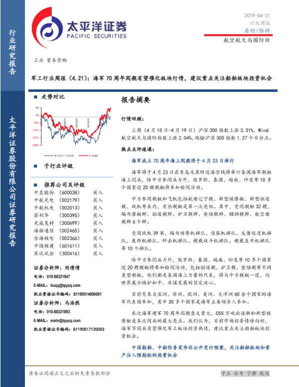 【太平洋证券】【20190421】军工行业周报:海军70周年阅舰有望催化板块行情,建议重点关注船舶板块投资机会-22页