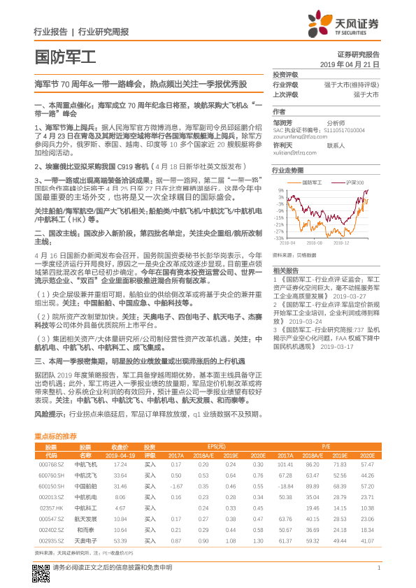 【天风证券】【20190421】国防军工行业研究周报:海军节70周年&一带一路峰会,热点频出关注一季报优秀股-2页