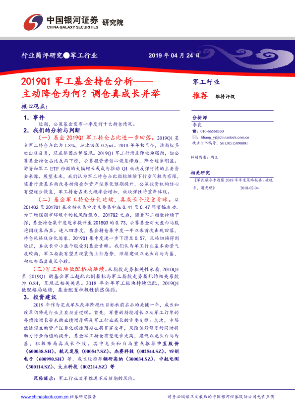 【银河证券】【20190424】2019Q1军工基金持仓分析:主动降仓为何?调仓真成长并举-10页