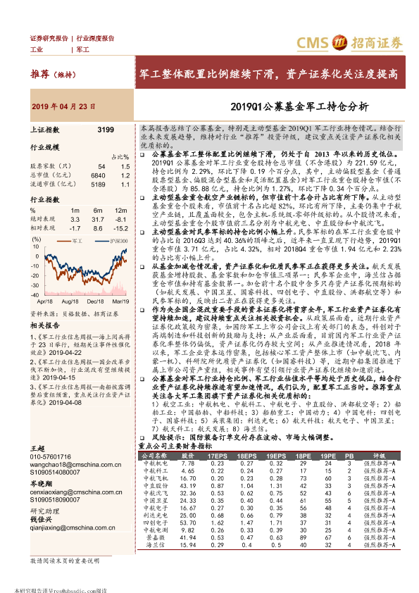 【海通证券】【20190423】2019Q1公募基金军工持仓分析:军工整体配置比例继续下滑,资产证券化关注度提高-18页