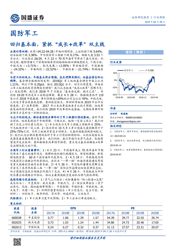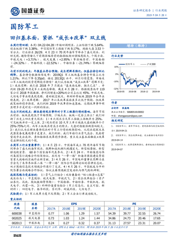 【国盛证券】【20190428】20190428-国盛证券-国防军工行业周报:回归基本面,紧抓“成长+改革”双主线-12页