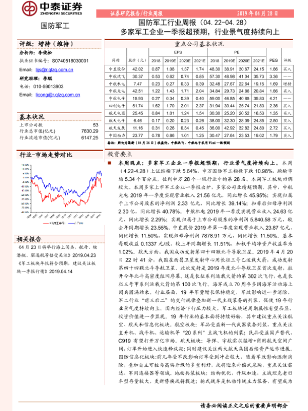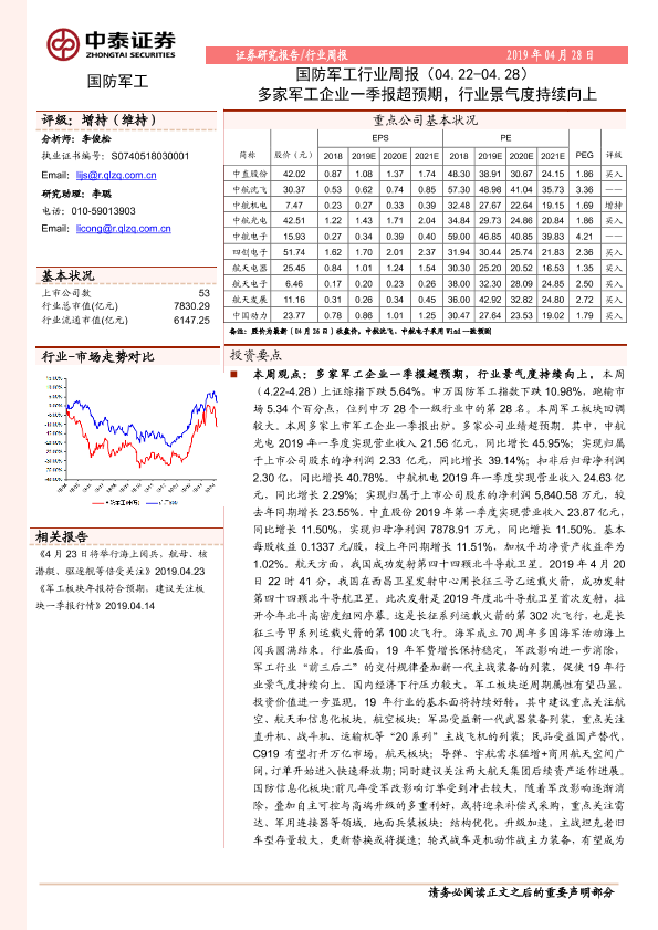 【中泰证券】【20190428】国防军工行业周报:多家军工企业一季报超预期,行业景气度持续向上-17页