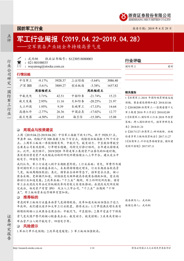【浙商证券】【20190429】20190429-浙商证券-军工行业周报:空军装备产业链全年持续高景气度-14页