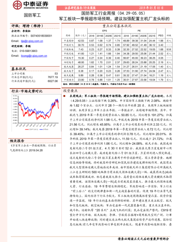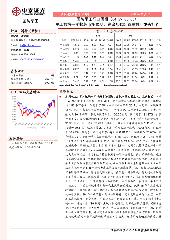 【中泰证券】【20190505】国防军工行业周报:军工板块一季报超市场预期,建议加强配置主机厂龙头标的-16页