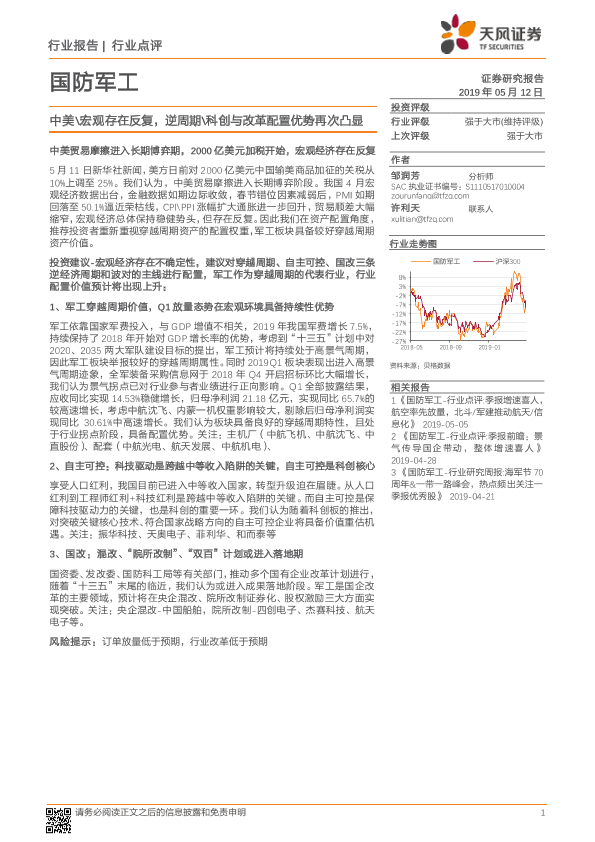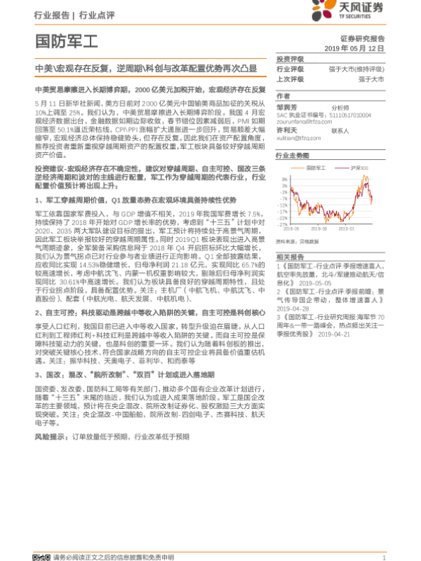 【天风证券】【20190512】国防军工行业点评:中美 宏观存在反复,逆周期 科创与改革配置优势再次凸显-3页