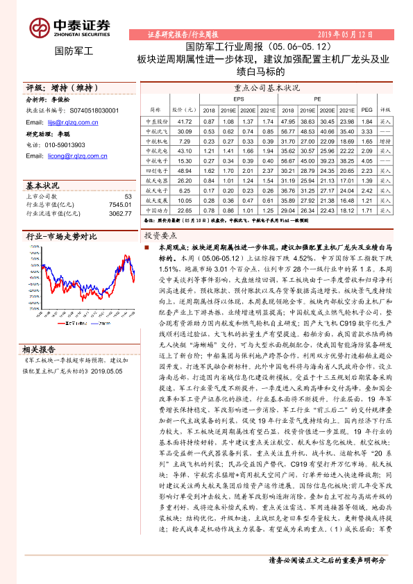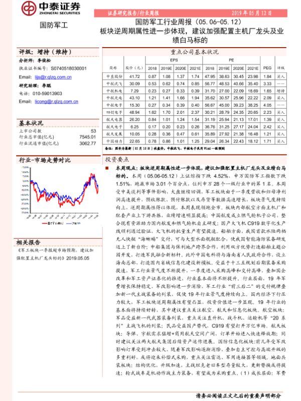 【中泰证券】【20190512】20190512-中泰证券-国防军工行业周报:板块逆周期属性进一步体现,建议加强配置主机厂龙头及业绩白马标的-14页