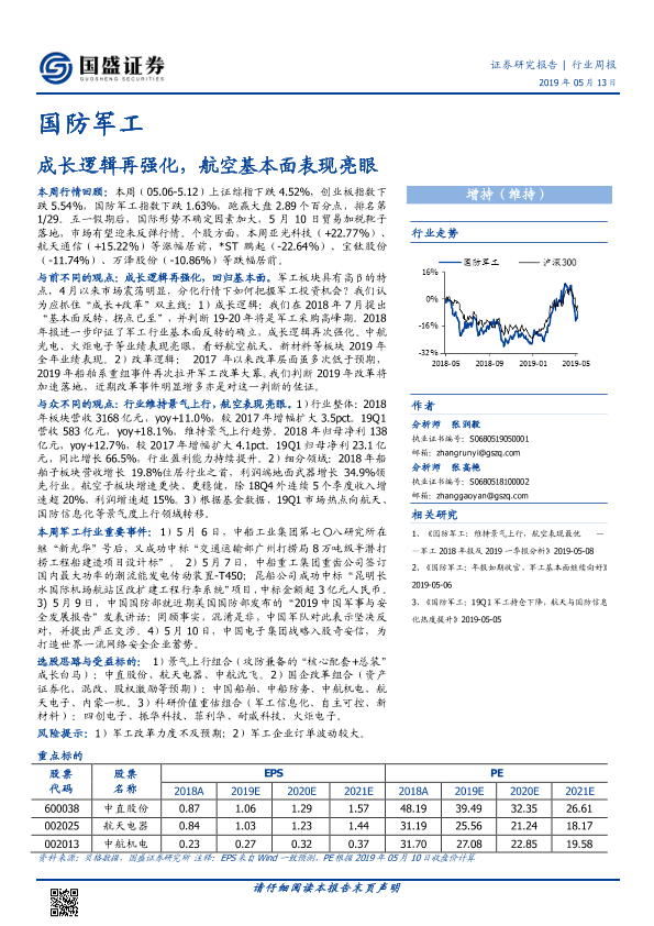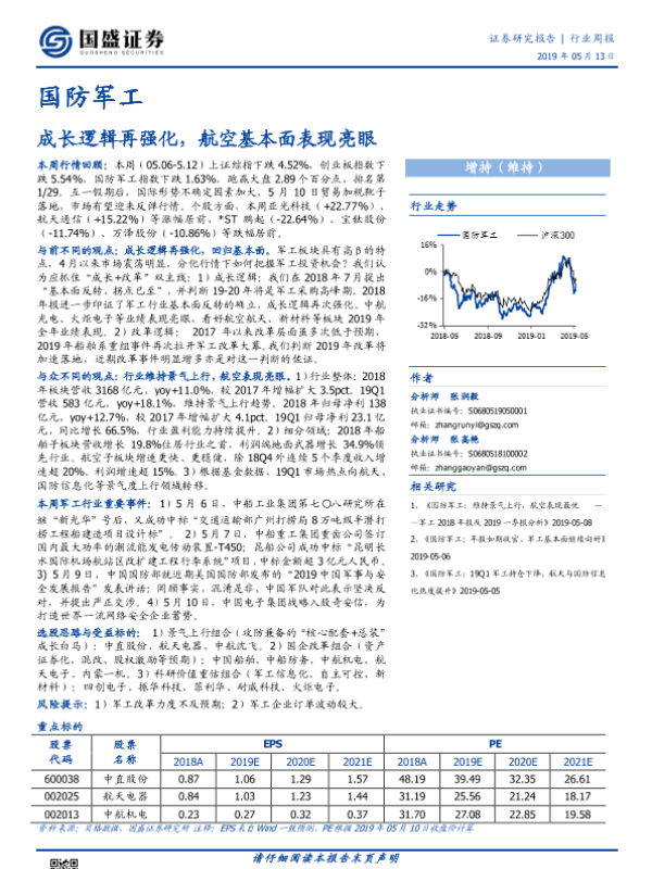 【国盛证券】【20190513】20190513-国盛证券-国防军工行业周报:成长逻辑再强化,航空基本面表现亮眼-16页