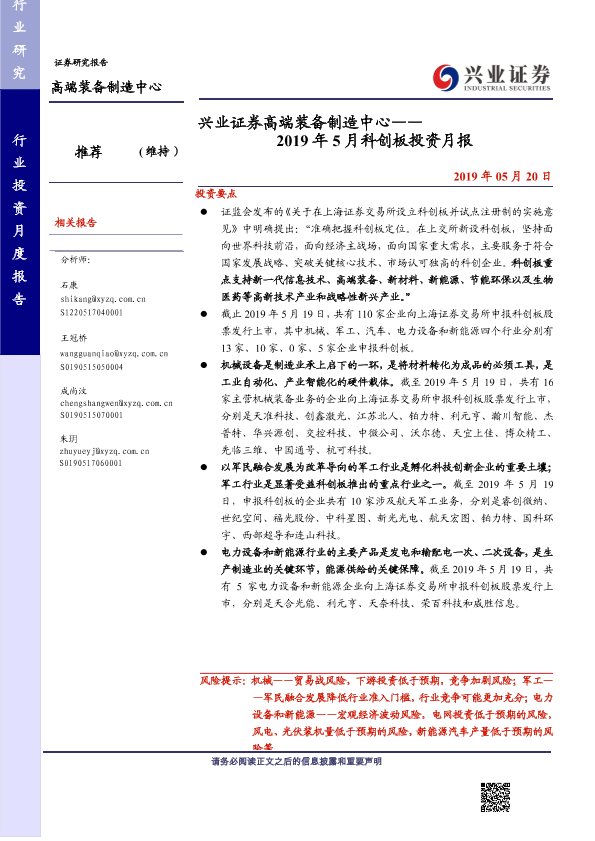 【兴业证券】【20190520】兴业证券高端装备制造中心——2019年5月科创板投资月报-18页