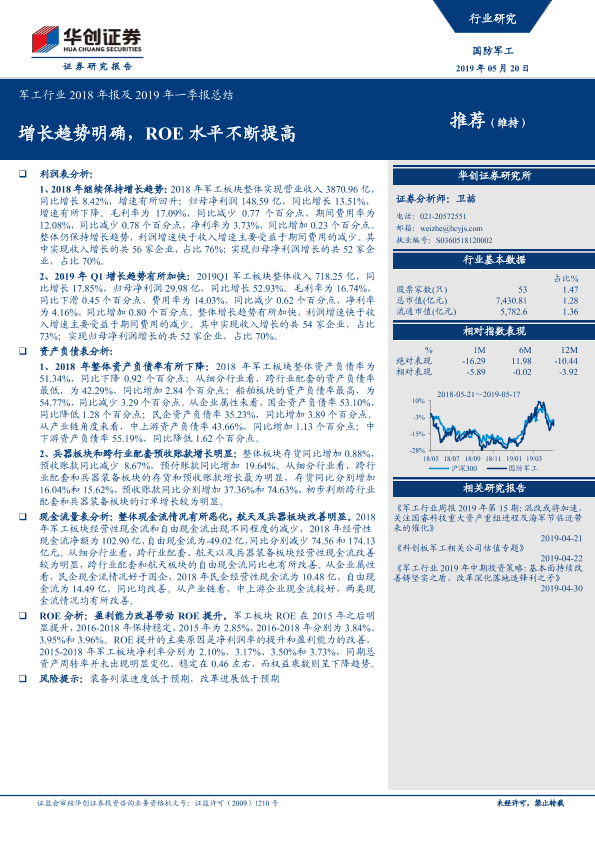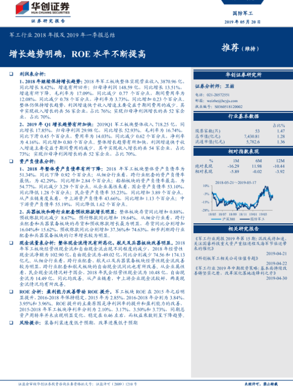 【华创证券】【20190520】军工行业2018年报及2019年一季报总结:增长趋势明确,ROE水平不断提高-26页