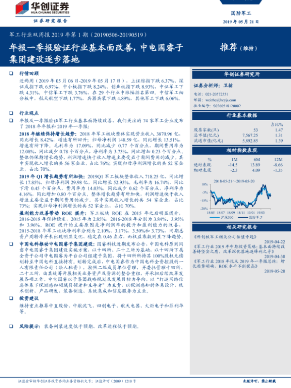【华创证券】【20190521】军工行业双周报2019年第1期:年报一季报验证行业基本面改善,中电国睿子集团建设逐步落地-20页