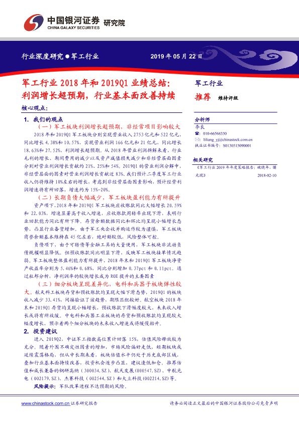 【银河证券】【20190522】军工行业2018年和2019Q1业绩总结:利润增长超预期,行业基本面改善持续-8页