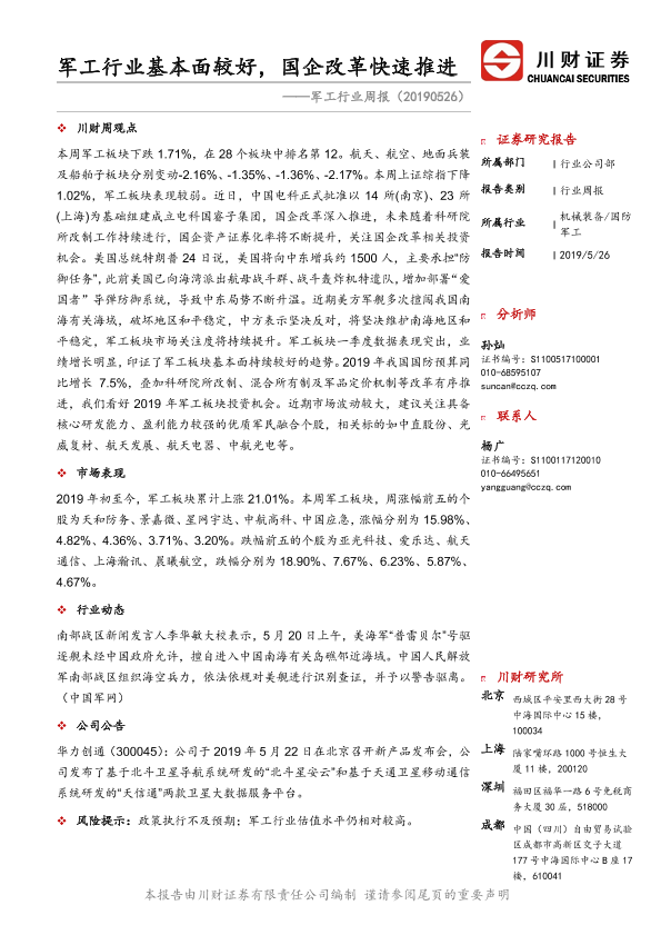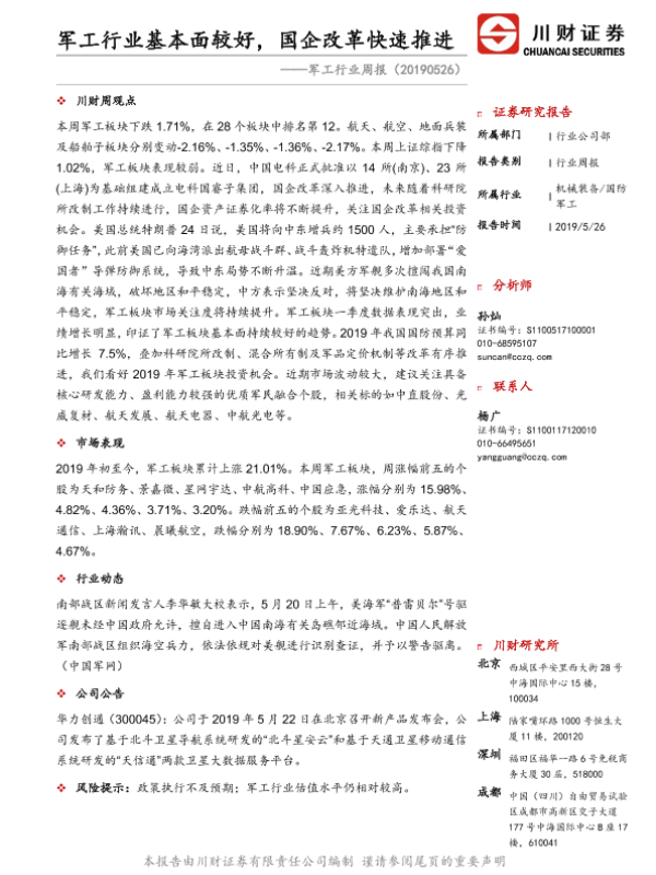 【川财证券】【20190526】军工行业周报:军工行业基本面较好,国企改革快速推进-9页
